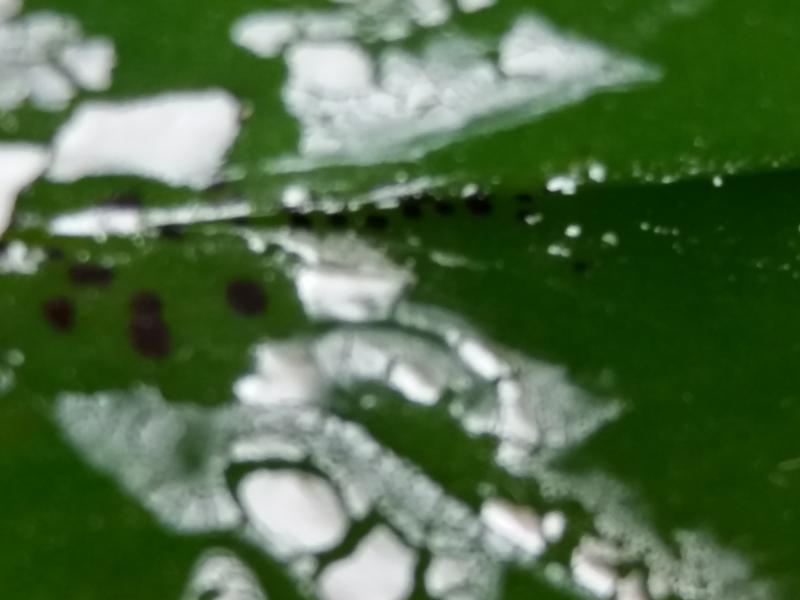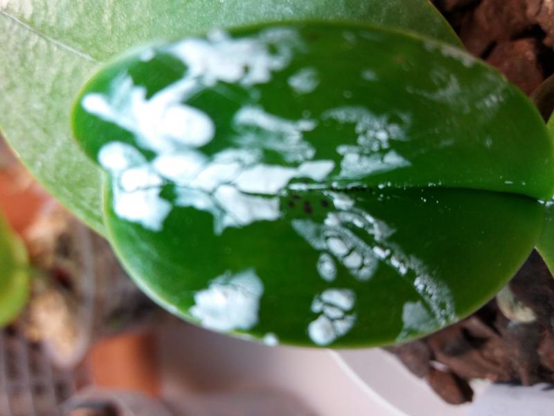 Здравствуйте, помогите советом. Получила из спецпредложений 20.10 P. Mitou King разм 2,5.Пришел в хорошем состоянии,рос в мхе. Я его пересадила в орхиату фракции 9-12мм пополам с мхом. Очень хорошо начал растить корни и новый листик. Но через некоторое время на новом листике стали появляться черные точки. Они постепенно увеличивались. Я с перепугу замазала эти пяна кашицей из фундазола, пролила гамаиром. Новая часть отрастала чистая. Потом увидела плесень в горшке, достала из горшка один корень основательно гнил, я его отрезала, замочила в фундазоле и посадила в чистую кору. Счистила немного фундазол с пятен и увидела, что они увеличелись, а сегодня появилось несколько точек на новом отросшем месте. у меня такое ощущение, что они появляются после полива. Я сейчас не замачиваю, просто проливаю. Пятна сухие, на обратную сторону листика не проступают.В целом растишка выглядит хорошо,проклюнулся новый корень, на старых листьях этих пятен нет. Стоит под люмкой, температура 25-26гр со всей малышней, никто не заразился. Шейка чистая, сухая.