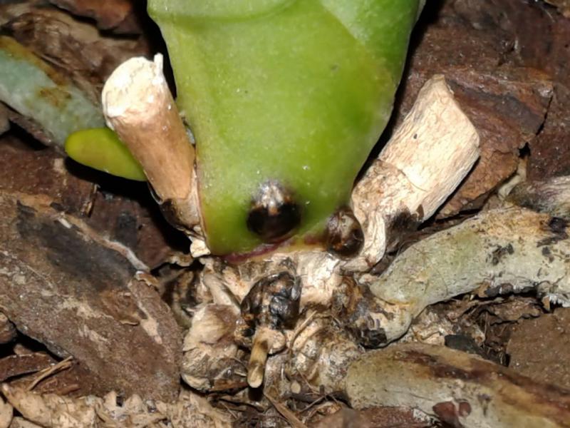 Наблюдал такое на своих наверное с полдюжины раз или поболее, никогда ничем плохим это не заканчивалось, причем я никаких мер химзащиты не принимал. Если обработаете фунгицидом - то хуже не будет, но и без обработки должно все быть нормально. Похоже, что этот грибок не поражает здоровые ткани, только зоны роста, в которых клетки по какой-то причине общего характера оказались ослабленными. Причем с одним из фалов такая ситуация повторяется в момент после цветения, но последующему росту и следующему цветению это не особо мешает. Перед цветением корни окукливаются, где-то ближе к концу цветения оставшиеся зоны роста на кончиках чернеют, потом идет пауза в несколько недель, потом начинается веселая движуха на листьях, а позже уже и корни резко бросаются в рост. Так что теперь я не особо переживаю по этому поводу.