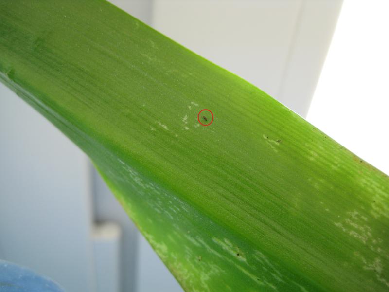 Явно поражены 4 фаленопсиса - на молодых листиках (размер листочков 1,5 - 3 см) появились липкие капельки и припухлости (как на коже, когда получишь ожег крапивой), на одном из них нашла бегающих по молодому листочку черных длинных и узких жучков, а на одном цимбе на листах, что-то похожее на белесые потеки. Да и летающего около цветка трипса убила...