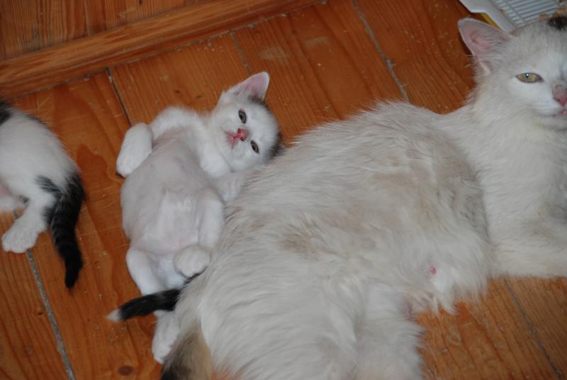 У меня была кошка, очень похожая на эту по характеру, тоже кусачая и вредная ))) только чисто-белая, очень похожая на ангору, хотя и беспородная. Мы её все равно любили ))) а котята у неё были 4 раза в жизни, от разных котов, но каждый раз - один белый, один трёхцветный, один чёрно-белый (а остальные как получится), даже называли их одинаково каждый раз.