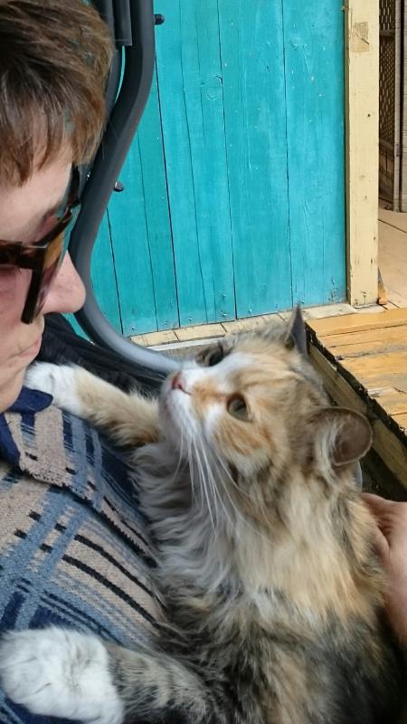 Кошка поселилась на даче несколько лет назад. Вернее, семейная пара. Она - черепаховая длинношёрстная, он - короткошёрстный чёрный бандит. Поселились под верандой, нас боялись, шмыгали под кустами по своим делам. Не раз замечали, что приходили другие коты и "наш" с ними дрался. Конечно, им оставляли остатки со стола. Осенью они обычно куда-то переселялись. В прошлом году в ноябре мы заехали проведать дачу и увидели их, почему-то они ещё были на даче. Тут же купили им рыбы, разложили на прикормленных местах)). Приезжали и потом, в декабре, в январе, кошек не видели, но оставленную еду явно кто-то уничтожал))) Потом стало по следам ясно, что на территорию проникли собаки, и точно прогнали кошанов. Но весной они вернулись, и кошка разительно поменяла своё поведение. Сначала она начала выпрашивать еду (раньше никогда не просили, но ели то, что им оставляли), потом позволяла себя погладить, а потом стала совершенно ручная, сейчас с рук не слезает, кошка чистая, никаких признаков паразитов нет, шерсть блестит, а подлиза каких поискать - на фото с моей мамой это видно:girl_game:
