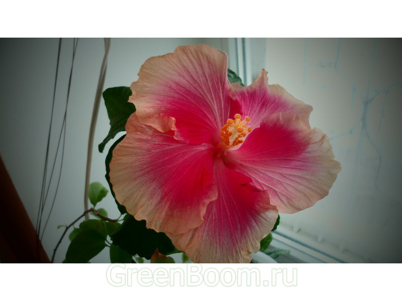 Розовый гибискус, цвет переходит от более насыщенного в середине к бледному по краям, очень эффектный.