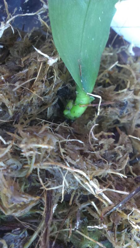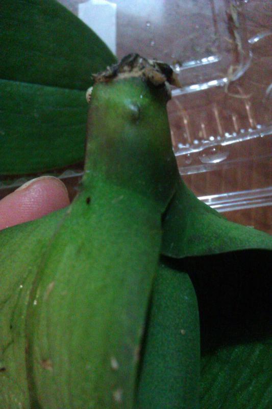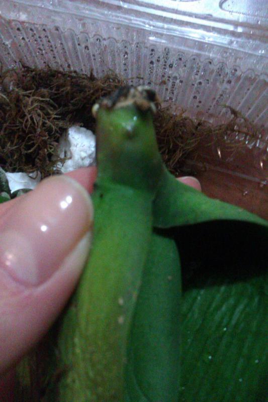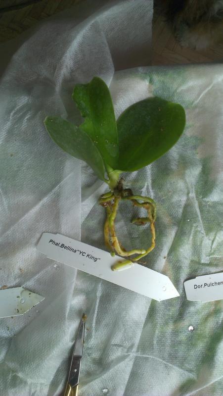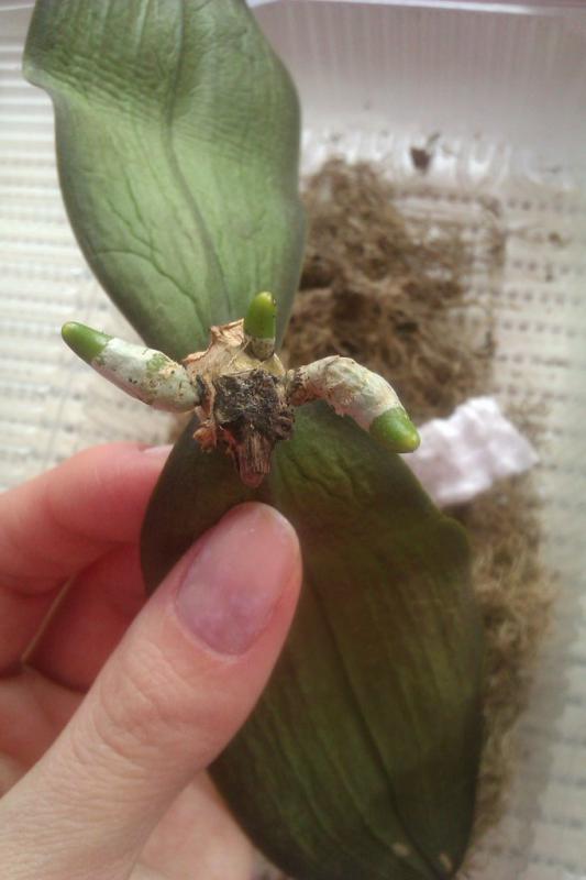 обработала, посадила по методу Клювдии, жду...:girl_rapture: вроде все хорошо сидит в коре со мхом и:spit: вдруг нижний лист усох, зажелтел и отпал , ну вроде все по методу, что не нужно сбросил... жду... оставшиеся 2 потихоньку тургор теряют... тут уж не до смотрелок, раскопала - итог корни все усохли и...:non: ни одного не осталось .Начались танцы и с тепличками, и с подвешиванием над водой и в тепло, аут... компрессы не помогают, выглядит уже так:IMAG0490.jpg