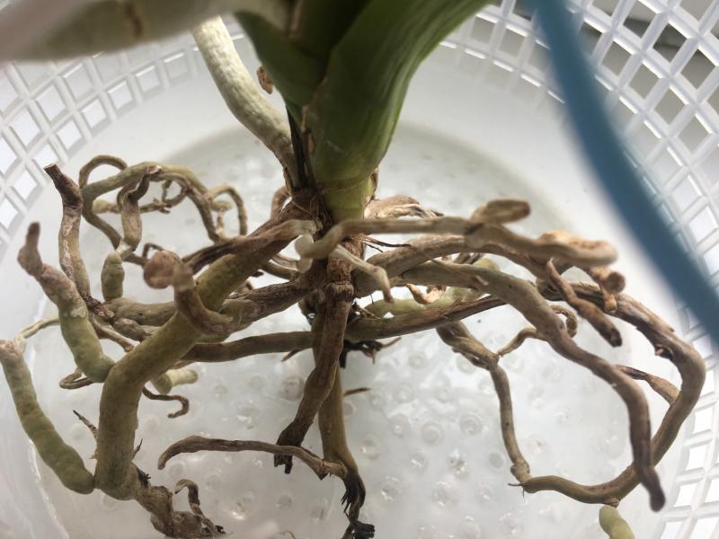 Мне досталась с тремя отсутствующими листьями посреди ствола, в корзинке с мокрой корой. Много корней было гнилых и совсем высохших, так что, пока у нас тепло и солнечно, ну и пока весна, я решила корзинку распотрошить и оставить растение с ОКС. Убирала только совсем мёртвые корни, почти всё или само отвалилось, или снималось лёгким прикосновением. Кое-что она впоследствии отсушила сама, я уже не трогаю.