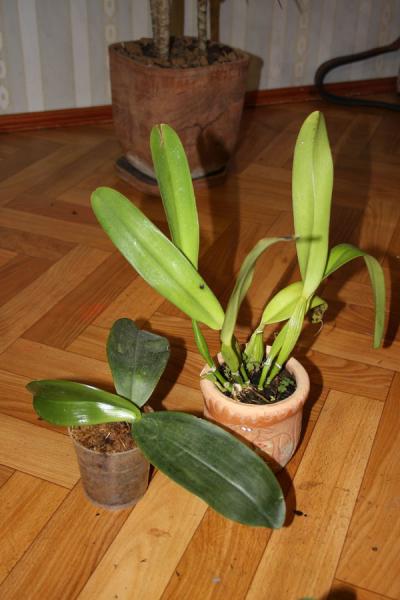 Cattleya Gaskelliana coerulea (на фото слева) 19 бульб, два роста длиной с палец, на фото их нет, оно делалось в феврале. Высота от пола примерно 35 см. Итальянская. Почти размера цветения, у меня не цвела. 1000 рублей