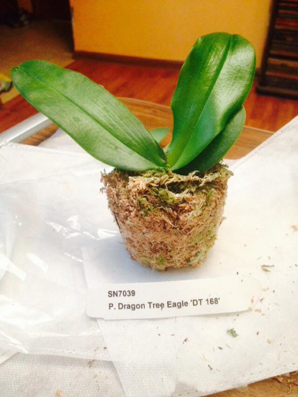 Хочу обратить внимание, что эта позиция в каталоге не просто Дракон, но теперь мериклон Phal. Dragon Tree Eagle DT168 Поэтому он так подорожал. Я на самом деле была в восторге, когда узнала эту инфу и с удовольствием доплатила разницу. Единственное, поставщик заявлял, что он теперь в размере 2,5. Но на самом деле именно моего Дракона совсем недавно запихали в горшок 2,5 и обложили корни мхом. Но ничего страшного, это всё равно очаровательный, крепенький подросток!!!! Никогда не цвел